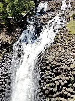 The walls of the canyon, called the Barranca de Alcholoya, are lined by polygonal columns between thirty and fifty meters high with five or six sides.[14] The basalt columns were created by the slow cooling of volcanic lava.[2] The visible columns are backed by even more polygonal basalt columns. There are two waterfalls. The higher one has its water supplemented by diversions from nearby dams.[14] The lower one is called the Cascada de la Rosa.[3][14] The canyon has been prepared by the addition of stairs, walkways and hanging bridges for easy access.[3]