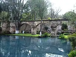 The other well-known hacienda of the area is San Miguel Regla, which is located just outside the town of Huasca, in a community also called San Miguel Regla. This hacienda was constructed by Romero in the 18th century and is also dedicated to mining.[4][12] The hacienda conserves many of its structures such as the five-meter stone perimeter wall, arches of the main patios, the main house, the smelting ovens (now flooded), holding tanks for ore and the gardens.[5] Much of the former property of San Miguel Regla is now ejido land,[4] but the complex has been converted into a hotel and ecotourism park. The main house is a luxury hotel, with small villas constructed over the property connected by footpaths. The gardens of the area are maintained as they were in the 18th century, with a modern heated swimming pool added. Other offerings include a clay tennis court, bar, game room, videorental and a meeting hall that accommodates 160 people. The lake by this hacienda has walking paths, fountains and a Greek-style theatre.[2][12]