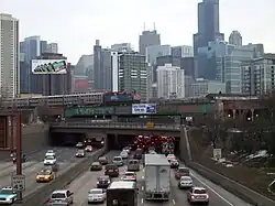 Hubbard's Cave and the Chicago skyline, in 2010. In a view facing southeast, Hubbard Street is seen crossing over the Kennedy Expressway, with the Metra tracks behind and above it.