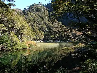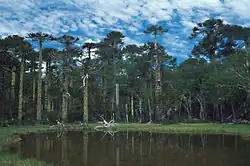 Located in the region known as Valdivian temperate rainforest, the forest can be more specifically described as Andean-Patagonian forest, and lies in a sub-region called the Araucanía Mountain range. The park also belongs to the region of deciduous forests, and within it, to the sub-region of the Andean deciduous forests. The first sub-region features the High-Andean deciduous forests with Araucaria araucana, while the second has the mixed Andean deciduous forest. The araucaria, which is currently considered a vulnerable species, is one of the most notable features of Huerquehue National Park.[2][3]