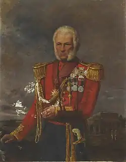 In April 1805, aged just fifteen, Wheeler was posted as a lieutenant to the 24th Native Infantry.[2] He was promoted to captain in 1819, transferred to the 48th Native Infantry in 1824, and was further promoted to major in 1829 and lieutenant-colonel in 1835.[3] He formed a relationship with Frances Oliver (née Marsden), an Anglo-Indian woman who was married to another officer. The couple had a number of children together and eventually married when Frances was widowed.