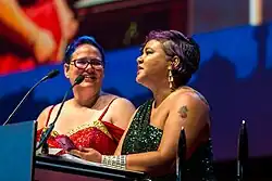 Julia Rios and Michi Trota accepting the 2017 Hugo Award for Best Semiprozine for Uncanny Magazine