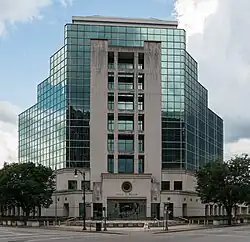 Funds for the construction of a new courthouse in Birmingham were appropriated by Congress in December 1982, and the following June, the General Services Administration chose the Birmingham architectural firm of Kidd/Ploaser/Sprague Architects Inc to design the building.[5] A location for the courthouse not yet having been determined, the City of Birmingham proposed a lot diagonal to the federal courthouse in use at the time, as part of an effort to promote the downtown area.[5] In 1984, it was reported that the building would be nine stories and 184,000 square feet, with construction to begin in April 1985 and end in February 1987.[6] A 1987 evaluation of work in the city by the architects noted of the building that it "has all of the right monumental materials, but they are organized in a carnival of geometry that fits irregular spaces in a familiar context", further describing it as "a kind of geometrical sculpture of reflective glass atop a stone pedestal that both respects and reflects the two monumental buildings (old US Courthouse and Federal Reserve Bank) across the street".[7]