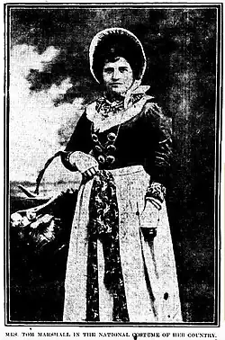 In September 1901, Hulda, dressed in traditional Danish costume, was in charge of the bachelor's stall at the Skandinavian fete, held in Sydney Town Hall, a rallying cry to all Skandinavians in Sydney, to raise money for a cot at the Children's Hospital, Glebe. She wore a black satin bonnet lined with quilted blue satin, a blue apron over her black satin dress, a kerchief with a silver fringe, and streaming ribbons of Danish woven silk.[48]