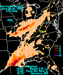 The interaction of Audrey and a second frontal system tracking across the Midwestern United States drew excess moisture across the region, leading to heavy rainfall across Missouri, Illinois, and Indiana. Rainfall in those states peaked at 10.20 in (259 mm) in Paris, Illinois, with a similar maximum of 10.16 in (258 mm) in Hermann, Missouri.[55] The rains in Paris, Illinois, contributed to the rainiest June in the city's history and a yearly record rainfall total.[72] Highways in Illinois were submerged for as long as three days.[54] Flash flooding in central Indiana led to the closure of 17 highways. Two women drowned after a bus was swept off one highway near Indianapolis, Indiana, where over 3 in (76 mm) of rain quickly fell.[73] Another three drowned in Indiana, in addition to the inundation of over 1,000 homes and 125 businesses. Flooding washed away roughly 500,000 acres (200,000 hectares) of crops and destroyed highway and railroad bridges. An 18-car work train fell into a creek near Reelsville, Indiana, after the bridge it was crossing succumbed to floodwaters. Railroad losses alone accounted for $1.2 million of the $2.45 million in damage wrought by Audrey in Indiana.[54]