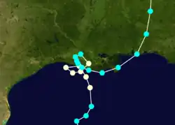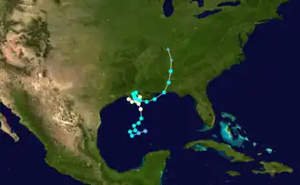 On October 31, the storm moved across the Mississippi Delta near Burrwood, Louisiana, and accelerated to the northeast,[3][2] influenced by an approaching upper-level trough.[5] At 1200 UTC that day, Juan attained a secondary peak of 70 mph (110 km/h). In the subsequent six hours, the storm weakened slightly, making its final landfall just west of Pensacola, Florida with winds of 65 mph (100 km/h) late on October 31.[3][2] After striking Florida, Juan turned to the north and weakened over land. After moving through Alabama, the storm became extratropical over Tennessee on November 1. Although the Atlantic hurricane best track ceased tracking the circulation at 1800 UTC that day,[3][2] Juan continued generally northward through the Ohio Valley, and the center eventually crossed into Canada. The energy from Juan helped spawn an occluded low in the Tennessee Valley, which produced more rainfall throughout the region.[5][6] An approaching cold front absorbed the remnants of Juan on November 3.[7]