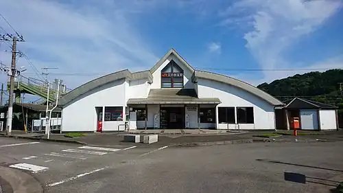 The station consists of an island platform serving two tracks at grade with two sidings. The station building is modern structure built in 1992 from local materials and designed with elements to resemble the town logo as well as an agricultural greenhouse, recalling the key economic activity of the town. It houses a staffed ticket window and a waiting area. Access to the island platform is by means of a footbridge. A bike shed is provided at the station forecourt. The station is not staffed by JR Kyushu but some types of tickets are available from a kan'i itaku agent on site who staffs the ticket window.[2][3][4][5]