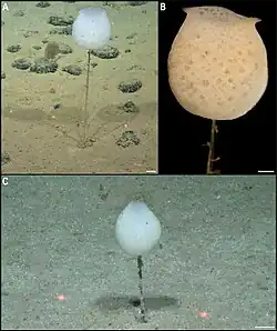 Hyalonematidae is a family of deep-sea glass sponges (class Hexactinellida) comprising five genera.[1] They are known for their unique siliceous spicules called amphidiscs and skeleton structure primarily composed of diactins, large, rod-like megasclere spicules found within the sponge's internal tissue (choanosome).[2][3] Hyalonematidae have been recorded at depths of up to 6000 meters and have a global distribution, though they have not been documented in the Arctic Ocean.[4] Initially mistaken for corals due to their fibrous base, Hyalonematidae were later recognized as glass sponges and classified within the order Amphidiscosida.[4] These sponges are generally hermaphroditic and reproduce both sexually and asexually.[5]
