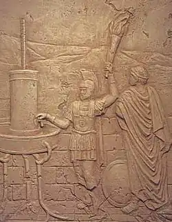 He says that those who are about to [communicate] urgent news to each other by fire signal should procure two earthenware vessels of exactly the same width and depth, the depth being some three cubits and the width one. Then they should have corks made a little narrower than the mouths of the vessels [so that the cork slides through the neck and drops easily into the vessel] and through the middle of each cork should pass a rod graduated in equal section of three finger-breadths, each clearly marked off from the next. In each section should be written the most evident and ordinary events that occur in war, e.g., on the first, "Cavalry arrived in the country," on the second "Heavy infantry," on the third "Light-armed infantry," next "Infantry and cavalry," next "Ships," next "Corn," and so on until we have entered in all the sections the chief contingencies of which, at the present time, there is a reasonable probability in wartime. Next, he tells us to bore holes in both vessels of exactly the same size, so that they allow exactly the same escape.