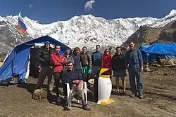 Ochoa died in 2008 while attempting to climb the 8,091-metre (26,545 ft) Nepalese mountain, Annapurna.[3] He was with his climbing partner, Romanian alpinist Horia Colibășanu,[1] when they were forced to halt their climb near the summit of the mountain because of dangerous weather conditions.[1] Ochoa had suffered severe frostbite to his hands.[3] Upon their descent back down the mountain, Ochoa collapsed and suffered a seizure near Annapurna's Camp 4.[1][3] He and his partner were unable to descend any further due to Ochoa's sudden illness and incapacitation.[3] Ochoa suffered from lung and brain damage due to the seizure.[1] His condition was further complicated by pulmonary edema.[1] Attempts were made to save Ochoa's life. Swiss climber Ueli Steck, who had abandoned his own attempt with Simon Anthamatten to climb Annapurna's south face due to avalanche threat the previous week, climbed to Ochoa's position to administer emergency medical aid.[1][3] Doctors from the Hospital of Navarre also tried to help Ochoa remotely from Pamplona.[1] However, heavy snow conditions and the high altitude made all rescue attempts impossible.[1] (Rescues above 7400 metres are usually impossible because helicopters cannot hover at that altitude and few people are able to handle the altitude.)[3] Steck and Colibasanu were left to administer first aid to Ochoa.[1]