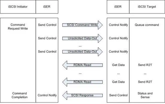 The main difference between the standard iSCSI and iSCSI over iSER is the execution of SCSI read/write commands. With iSER the target drives all data transfer (with the exception of iSCSI unsolicited data) by issuing RDMA write/read operations, respectively. When the iSCSI layer issues an iSCSI command PDU, it calls the Send_Control primitive, which is part of the DI. The Send_Control primitive sends the STag with the PDU. The iSER layer in the target side notifies the target that the PDU was received with the Control_Notify primitive (which is part of the DI). The target calls the Put_Data or Get_Data primitives (which are part of the DI) to perform an RDMA write/read operation respectively. Then, the target calls the Send_Control primitive to send a response to the initiator. An example is shown in the figures (time progresses from top to bottom).