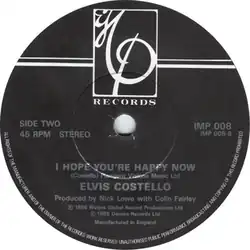 According to Elvis Costello, the final version of "I Hope You're Happy Now" was recorded after "three different attempts" to get the song right.[2] Costello and the Attractions attempted to record the song after Goodbye Cruel World with Nick Lowe, who had not produced a Costello album since Trust, but these recordings were shelved.[3] An early version of the song was performed by Costello and the Attractions on the Tonight Show in 1984.[4] The song was later attempted again during the King of America sessions; early versions of the song have since been released on expanded versions of both Goodbye Cruel World and King of America.[5] He recalled,