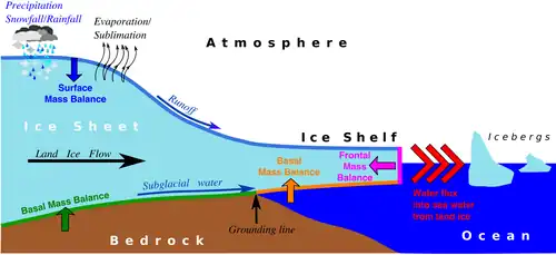 Precipitation is directly tied to air temperature, and also depends on moisture above and around the ice sheet.[17] Precipitation plays an important part in ice-sheet melting and accumulation.[17]