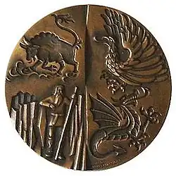 The modern coinage of Iceland frequently displays elements of the contemporary national coat of arms, including the shield and/or the four "guardian spirit" supporters. One notable example of a numismatic display of Icelandic heraldry is the 1974 bronze medallic coin pictured above.