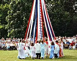 Ickwell is one of few villages in the United Kingdom to have a permanent maypole; in 1872, a larch pole sourced from Warden Warren, a forest in the nearby village of Old Warden, was erected on the village green.[5] The pole was donated by Squire Thomas Hervey, owner of the nearby manor house Ickwell Bury, to celebrate the birth of his son.[6] The pole was cemented in 6 feet of concrete, and had a height and circumference of 67 and 4 feet respectively. Before the instalment of the maypole, a pole had been put in place on the night before the May Day celebrations, and taken down on the night of May Day.[5] The pole was replaced in 1911, again with a larch from Warden Warren,[7] due to poor condition of the pole; May Day was not celebrated in 1910 due to this. The new pole was described as "broader but not quite so tall" in an account in the Bedfordshire Times, with a "brave coat of red and white paint, surmounted by a great Union Jack".[5] In an 1877 will, Hervey directed three shillings and ten pence (equivalent to £24 in 2023) to be paid annually for the upkeep of the festival.[6]
