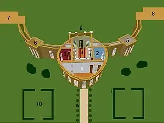 Unlike the design of a true Palladian building, the terminating pavilions, rather than minor balancing appendages, are in fact large wings, complementary in weight to the rotunda which becomes their corps de logis. The East Wing, a small mansion in itself, was designed to be the everyday living quarters of the family (which it remained until 1998), thus permitting the more formal rooms of the rotunda to be reserved for entertaining and display. The west wing, intended as an orangery, sculpture gallery and service rooms remained an unfinished shell until the beginning of the 21st century. For much of the time it was used as agricultural storage and latterly for playing squash on a court installed by the 4th Marquess.[4]