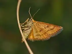 Idaea flaveolaria has a wingspan of 12–14 millimetres (0.47–0.55 in) in females and 14–18 millimetres (0.55–0.71 in) in males. The basic color of the wings is bright brown orange. On the forewings and hindwings there are two brown transversal lines, often almost indistinct. These transversal lines appear more clearly on the underside of the wings, together with a dark discal spots. The edge of the wings shows a blackish fringe.[3]