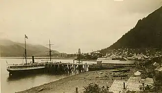 Cruising to Alaska became popular among vacationers in the early 1880s, and gold mining began in earnest in Juneau in 1881. With these two new demands for shipping, the Pacific Coast Steamship Company assigned Idaho to the Alaskan trade. She sailed From Port Townsend for Harrisburg (now Juneau), Sitka, and Fort Wrangell for the first time on July 1, 1882.[30] The ship made stops in Victoria and Nanaimo, British Columbia en route, the latter for coal.[31] She sailed this route year-round except for trips back to San Francisco for maintenance[32][33] for the next five years. The route was a success for Idaho. In fact, the Summer 1886 cruise season to Alaska was so popular that the ship was cited for carrying 215 passengers on one trip, 15 more than she was licensed for at the time. One of these was the Chief Justice of the United States Morrison Waite.[34] Similarly, success of the Juneau gold mines continued the demand for transport of mining machinery and goods to Alaska.[35] In February 1887 Idaho carried $60,000 in gold bullion south from the mines.[36]