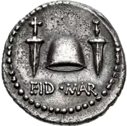 The coin was struck with the words EID MAR (short for Eidibus Martiis – on the Ides of March) to commemorate the assassination of Julius Caesar on March 15, 44 BC.[2] The assassin Brutus appears on the coin's obverse with a bust of him, looking to the right. The reverse of the coin displays a pileus cap flanked by two daggers. EID MAR appears on the reverse below the daggers to commemorate the assassination of Caesar during the Ides of March.[3] The pileus cap was a Roman symbol of freedom, and was often worn by recently freed slaves.[4] The daggers represent the weapons which were used to kill Julius Caesar.[5]