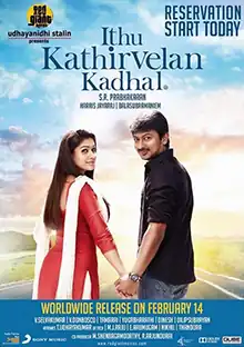 Ithu Kathirvelan Kadhal (transl. This Is Kathirvelan's Love) is a 2014 Indian Tamil-language romantic comedy drama film written and directed by S. R. Prabhakaran starring Udhayanidhi Stalin and Nayanthara.[1] Santhanam and Sunder Ramu play important roles in the film while Saranya Ponvannan and Chaya Singh play supporting roles.[2] Produced by Red Giant Films, the film has cinematography by Balasubramanium and art direction by V Selvaraj.[3]