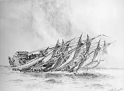 Two[38] or three minutes after the first gust hit, another powerful blast of wind from the northeast pushed the Idler over onto her starboard side.[29][40][45] Her mainsail went into in water, the soaking wet canvas acting like an anchor and keeping her on her beam end.[40] Most of the crew was thrown into the water.[31]