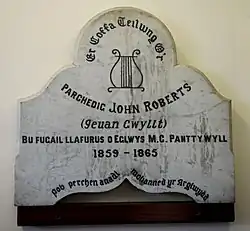 Memorial to Roberts, commemorating his ministry at Pant‑tywyll Calvinistic Methodist church, Merthyr Tydfil. Now in Canolfan Soar, Merthyr Tydfil.