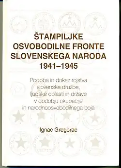 - ^ a b c Gregorač, Ignac, (1997). Štampiljke Osvobodilne fronte slovenskega naroda, 1941 – 1945: podoba in dokaz rojstva slovenske družbe, ljudske oblasti in države v obdobju okupacije in narodnoosvobodilnega boja (The Official Stamps of the Liberation Front of the Slovene Nation 1941–1945: Vision and Proof of the Birth of the Slovenian Society, People's Government and State during Occupation and National Liberation War). Str. 37–38. Društvo piscev zgodovine NOB Slovenije (Partizanski knjižni klub), Ljubljana.