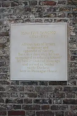 Charles Ignatius Sancho (c. 1729 – 14 December 1780) was a British abolitionist, writer and composer. Considered to have been born on a British slave ship in the Atlantic, Sancho was sold by the British slave traders into slavery in the Spanish Viceroyalty New Granada.[4] After his parents died, Sancho's owner took the two-year-old orphan to Britain and gave him to three sisters living in Greenwich, where he remained for eighteen years. Unable to bear being a servant to them, Sancho ran away to the Montagu House in Blackheath, London where John Montagu, 2nd Duke of Montagu taught him how to read and encouraged Sancho's budding interest in literature. After spending some time as a butler in the household, Sancho left and started his own business as a shopkeeper, while also starting to write and publish various essays, plays and books.