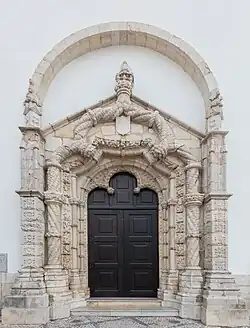 The windows and upper gable of the main façade are derived from the 18th century reconstruction of the church, but the simple main portal is still Manueline. More notable is the decorated lateral portal, a nice Manueline work with twisted columns imitating ropes, vegetal motifs and trilobed arches.