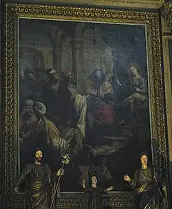 The middle row dating back to the 18th century is attributed to André Gonçalves. It depicts various stages of the Passion of Christ interlaced with allegoric paintings captioned with Biblical passages.[71] These pieces were old processional banners, commissioned in 1761 by the Lisbon Holy House of Mercy from Gonçalves; later on they were taken apart and arranged as pictures in the sacristy.[72] In the upper frieze the paintings are of scenes from the life of St. Ignatius of Loyola, founder of the Society of Jesus. They came here from the now-defunct Jesuit novitiate at Cotovia and are attributed to Domingos da Cunha, the Cabrinha.[73]
