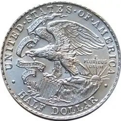 The reverse was designed by the assistant engraver who would succeed Morgan on his death in 1925, John R. Sinnock.[9] It is an adaptation of the Seal of Illinois, an eagle perched on a rock mound, with the rising Sun beyond it. The bird holds in its beak a scroll with the Illinois state motto, STATE SOVEREIGNTY, NATIONAL UNION and it clutches the Federal shield.[13] An olive branch is seen, but without any arrows representing war, even though these symbols are often paired on U.S. coins. Anthony Swiatek and Walter Breen suggested "their presence on a coin designed during the concluding months of World War I might have been considered just a bit raw".[10] The reverse also bears the legends, UNITED STATES OF AMERICA, E PLURIBUS UNUM (the national motto, meaning "out of many, one") and HALF DOLLAR.[13]