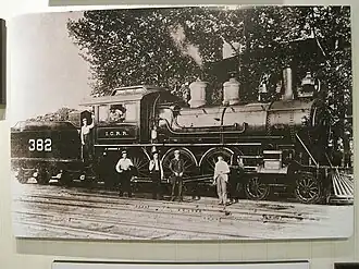 Illinois Central No. 382, also known as "Ole' 382" or "The Cannonball", was a 4-6-0 "Ten Wheeler" bought new from the Rogers Locomotive Works in Paterson, New Jersey for the Illinois Central Railroad.[1] Constructed in 1898, the locomotive was used for fast passenger service between Chicago, Illinois and New Orleans, Louisiana.[1] On the night of April 30, 1900, engineer Casey Jones and fireman Simeon "Sim" Webb were traveling with the engine from Memphis, Tennessee to Canton, Mississippi.[1][2] The train collided into the rear of a freight train stuck on the mainline, killing Jones, and injuries dozens more in Vaughan, Mississippi, the last station before Canton.[2] After the accident, the locomotive was rebuilt in Water Valley, Mississippi, and returned to service.[1][2] The locomotive was believed to be cursed after Jones' death as it would suffer three more accidents in its career before being retired in July 1935, and scrapped.