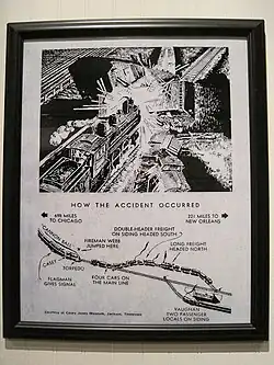 As Jones drove No. 382 down toward Canton, the station and sidings in Vaughan, Mississippi were filled with three trains all at the same time. The crucial train was a doubleheader going southbound, as its train was too long for the siding. As the "New Orleans Special" rounded an S-Curve, fireman Simeon Webb spotted the doubleheader stuck on the tracks.[3] After yelling at Jones about the train, he applied the emergency brakes and threw No. 382 into reverse at the same time. Jones told Webb to jump out, and so Webb did, getting knocked unconscious as he hit the ground. Jones' train crashed at 3:52 AM and smashed through a caboose, two separate boxcars, one full of hay and the other for corn, and halfway through a flatcar of lumber.[3] Jones was the only fatality from that accident.[3]