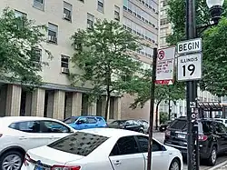 The original Route 19 was designated in 1918 as what is now U.S. Route 14 from Chicago Loop to Harvard.[4][5] In 1935, the routing was removed,[6] and in 1949 it was reapplied on part of its modern-day routing.[7] As of 1968, IL 72 was cut back from Lake Shore Drive (US 41) to its present terminus. As a result, the IL 19 designation was extended from its terminus at Narragansett Avenue (formerly assigned as part of IL 72) by 7 miles (11 km) to Lake Shore Drive in Chicago.[8][9]