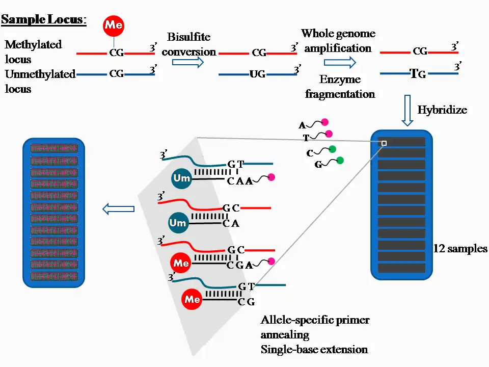 The bisulfite-converted amplified DNA products are denatured into single strands and hybridized to the chip via allele-specific annealing to either the methylation-specific probe or the non-methylation probe. Hybridization is followed by single-base extension with hapten-labeled dideoxynucleotides. The ddCTP and ddGTP are labeled with biotin while ddATP and ddUTP are labeled with 2,4-dinitrophenol (DNP).[7]