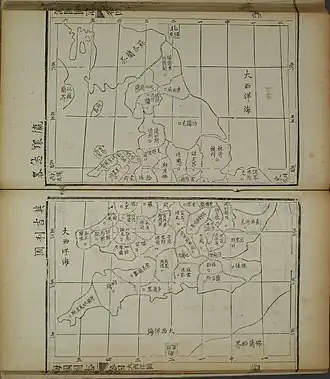 The Illustrated Treatise on the Maritime Kingdoms, or Haiguo Tuzhi, is a 19th-century Chinese gazetteer compiled by scholar-official Wei Yuan and others, based on initial translations ordered by Special Imperial Commissioner Lin Zexu. The Treatise is regarded as the first significant Chinese work on the West[1] and one of China's initial responses to the Anglo-Chinese First Opium War (1839–1842).[2] Eventually stretching to one hundred juan, or scrolls, the treatise contains numerous maps and much geographical detail covering both the western and eastern hemispheres. The main principles advocated in the Treatise were later absorbed by the Self-Strengthening Movement, and the book also garnered significant interest in Japan and helped mould the country's foreign policy with respect to the West.