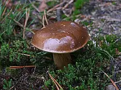 The bay bolete is common in coniferous and less commonly mixed woodlands in Europe, from the British Isles, where it is abundant throughout from August to November,[34] east to the Black Sea Region in Turkey.[35] In Asia, the species has been recorded from Jordan[36] mainland China,[37] and Taiwan.[23] The North American distribution extends from eastern Canada west to Minnesota and south to North Carolina, where the mushroom fruits from July to November.[38] It also grows in central Mexico.[39] The variety B. b. macrostipitatus is found from eastern Canada south to Maine and New York state,[24] while variety B. b. glaber is known from the Atlantic Maritime Ecozone of eastern Canada.[40] Fruit bodies appear singly or scattered on the ground, or on decaying tree stumps, and can be well hidden by pine needles and ferns. Fruiting tends to peak three or four days after rain during warm weather.[41] They can be prolific, especially in highland areas that are humid and shady.[22] It is commonly found under white pine, spruce, and hemlock,[26] and also occurs under deciduous trees, especially beech.[22] It can also occur in grassy or mossy areas at or near forest margins;[21] Italian restaurateur and cook Antonio Carluccio recalled picking them in the grounds of Blenheim Palace.[41] It does not occur on calcareous (chalky) soils.[27]