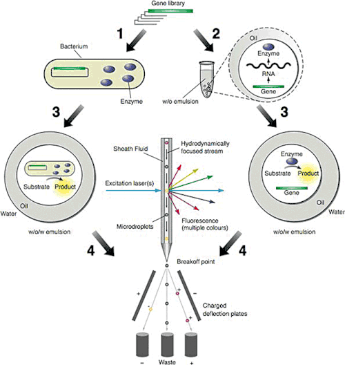 3,4) In both cases, droplets are then resuspended in water to make a water‐in‐oil‐in‐water (w/o/w) emulsion, have a fluorogenic substrate added, and passed in front of the laser and detector in a fluorescence activated cell sorter. This causes genes that encode active protein variants to be isolated and amplified, sequenced and used for further rounds of selection or directed evolution.[2]