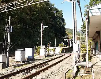The station has one island platform serving two tracks, connected to the small station building by a level crossing. The station is unattended.