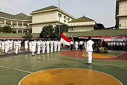 Ceremonies and festivities are held throughout the country to celebrate this national day, including the flag hoisting ceremony conducted nation-wide and at Indonesian diplomatic installations abroad, local community competitions, with patriotic and cultural parades.[3] Discounts are offered by participating shopping centres or businesses.[4] On 16 August or the last Friday prior to 17 August, the president of Indonesia addresses the nation at the People's Consultative Assembly.[5]