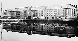 Funders and organizers of the construction of India Wharf in 1803 on the waterfront near Long Wharf included Francis Cabot Lowell, Uriah Cotting, Henry Jackson, James Lloyd Jr., and Harrison Gray Otis.[2][3] Builders completed the wharf in 1804. Architect Charles Bulfinch designed the building atop the wharf, completed in 1807.[4] The long stone building housed 32 stores.[2] An observer in 1815 described: "Across from the long wharves, or in the western part of the city, the India Wharf runs from north to south. An immense stone store, 1,340 feet in length, is divided into rooms containing merchandise from the East Indies...."[5]