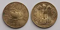 coin is a former denomination of the Indian rupee. The 20 Paise coin equals 1⁄5 of a rupee.[1]