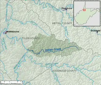 Indian Creek is a tributary of Middle Island Creek, 14.8 miles (23.8 km) long,[3] in northern West Virginia in the United States. Via Middle Island Creek and the Ohio River, it is part of the watershed of the Mississippi River, draining an area of 32.3 square miles (84 km2)[4] in a rural region on the unglaciated portion of the Allegheny Plateau.