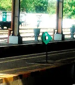| The Semboyan 9J is a permanent signal in the form of a number on a square board which indicates that the train will enter the designated track number. | |