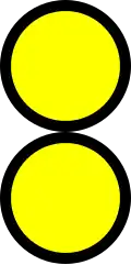 Semboyan 2B in the form of two round yellow signs or an officer waving two yellow flags - Semboyan 2B1: Two round yellow signs with black borders (above a black square marking with a white vertical line), or an officer holding two yellow flags or a yellow handsign in his right hand. Indicating that electric trains passing through must be careful with a maximum speed limit of 20 kilometres per hour (12 mph).