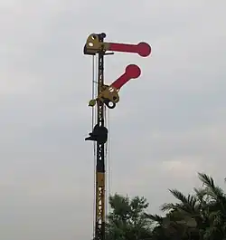 The Tebeng signaling device was the first railway signaling equipment used on Staatsspoorwegen lines since it first operated in 1878. The Krian signaling device (Dutch: Krianinrichting) was a development of the Tebeng signal, which used a tall tower equipped with locking equipment. The name of this signaling equipment is attributed to Krian Station, a railway station in Sidoarjo Regency, which was also the first station to use the signaling.[5] The last railway line to use the Krian signal was the Kalisat–Panarukan railway line, which was closed in 2004.[6] It is recorded that the Krian signal has been preserved at Krian Station, Tamanan Station,[7][6] Ambarawa Railway Museum,[8][9] and Garut Station.[10]