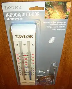 The primary purpose of the indoor-outdoor thermometer is to allow the outside temperature to be indicated inside a building, thus removing the need to go outside to take a temperature reading. They are also used in vehicles, and are particularly useful for municipal vehicles involved in snow and ice clearance.[5] Building maintenance engineers can use an indoor-outdoor thermometer that has not been installed to get a quick reading of air temperature in a location inside a building. This is done by swinging the bulb of the outdoor sensor in the air while still attached to the instrument.[6] This will get a faster reading because the bulb will come up to temperature much more quickly than the indoor sensor built into the instrument.