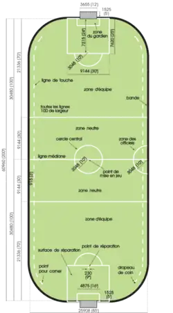 - The Field. Most indoor soccer arenas are rectangular or oblong in shape, with artificial turf floors. In many collegiate intramural leagues, the game may be played on basketball courts, in which case the floor is hardwood. Walls (often the hockey dasher boards and plexiglas used for that sport) bound the arena. Field sizes are generally smaller than soccer fields, and the goals are recessed into the walls. Goals are also smaller than in standard soccer and the penalty area is also smaller. The field is commonly 200' by 85' (approx 61m by 26m), the regulation size for a hockey rink in North America.