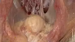 | Enlarged bursa of Fabricius with yellowish peribursal oedema | |