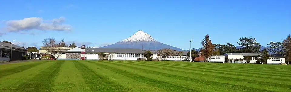 The school crest was designed in 1957 by Margaret Stevenson (née Cooke).[3] It displays nearby Mt Taranaki, the book of learning, the messenger's feet and the motto, constantia vincit (constant effort ensures success).